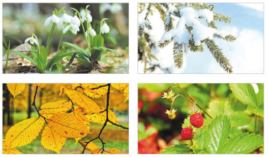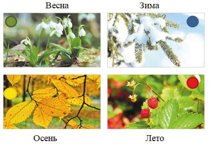 ► Рассмотри фотографии. Отметь фишками разного цвета те из них, которые относятся: к осени; к зиме; к весне; к лету.