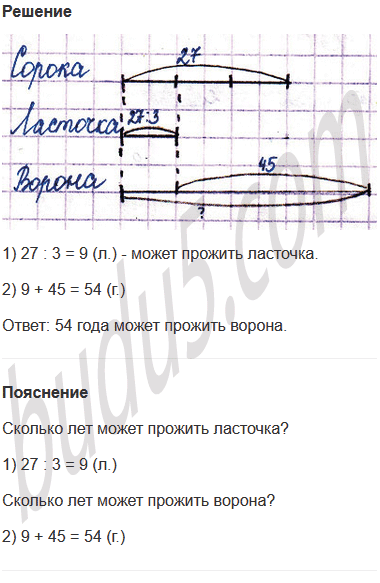 Задание № 7. Сорока может прожить 27 лет, ласточка - в 3 раза меньше, чем сорока, а ворона - на 45 лет больше, чем ласточка. Сколько лет может прожить ворона?