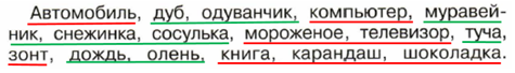 Автомобиль, дуб, одуванчик, компьютер, муравейник, снежинка, сосулька, мороженое, телевизор, туча, зонт, дождь, олень, книга, карандаш, шоколадка.