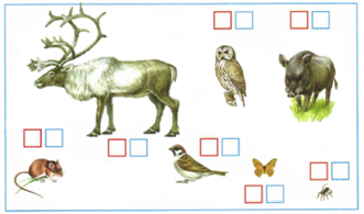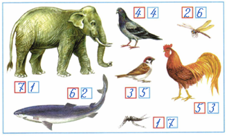 6. Сравни размеры животных, изображённых на рисунке. В красных квадратиках пронумеруй животных в порядке увеличения размеров. В синих квадратиках пронумеруй в порядке уменьшения размеров. Попроси соседа по парте проверить тебя.