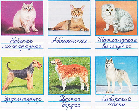1. Узнай породы кошек и собак по фотографиям. Подпиши названия. Можешь воспользоваться словами для справок. Проверь себя в Приложении.