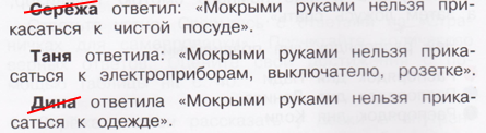 Таня ответила: "Мокрыми руками нельзя прикасаться к электроприборам, выключателю, розетке".