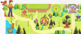Чтобы найти дорогу в музей, Серёже и Наде надо ориентироваться по следующим предметам: лодочный причал, песочница, качели, стадион, детская карусель, большое дерево с дуплом, фонтан. Ещё нужно обратить внимание, что вдоль дороги в музей расположены одинаковые уличные фонари.