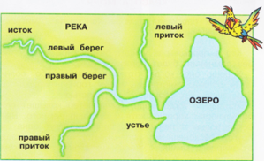 Все реки имеют начало – исток. От истока река течёт по руслу и впадает в другой водоём: реку, озеро, море. Место, где река впадает в другой водоём называют устьем. А углубление, по которому течёт река, – это русло. По краям русла находятся правый и левый берега. Если смотреть в сторону течения реки, то справа будет правый берег, а слева – левый.