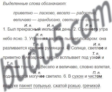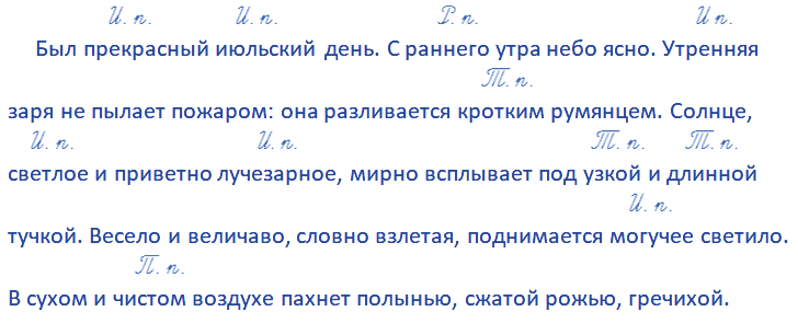1. Был прекрасн... июльск... день. 2. С ранн... утра небо ясно. 3. Утренн... заря1 не пылает пожаром: она разливается кро́тк... румянцем. 4. Солнце, светл... и приве́тно лучезарное, мирно всплывает под узк... и длинн... тучкой. 5. Весело и велича́во, словно взлетая, поднимается могуч... свети́ло. 6. В сухом и чист... воздухе пахнет полынью, сжатой рожью, гречихой.4