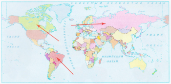10. Ребята получили задание показать на политической карте мира Россию, Канаду и Бразилию.