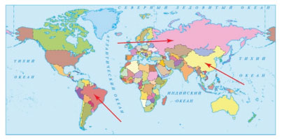 10. Ребята получили задание показать на политической карте мира Россию, Китай и Бразилию.