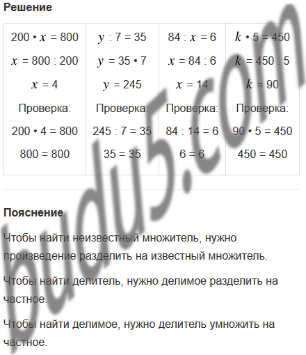| 200 • x = 800 | у : 7 = 35 | 84 : х = 6 | k • 5 = 450 |
