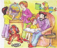 В семье Серёжи и Нади четыре человека. Это папа, мама и их дети – Серёжа и Надя. Ещё с ними живут попугай и собака. В этой семье все с уважением относятся друг к другу. Это видно по поступкам: папа читает Наде книгу; мама помогает Серёже с выполнением домашних заданий. У всех довольный вид, они рады общению. В семье Серёжи и Нади душевное тепло и уют.
