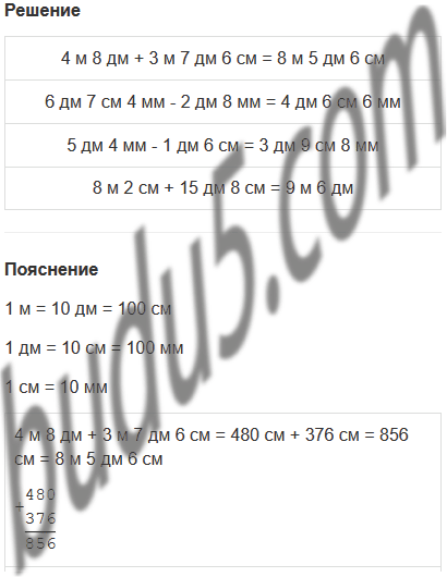 | 4 м 8 дм + 3 м 7 дм 6 см | 5 дм 4 мм - 1 дм 6 см |