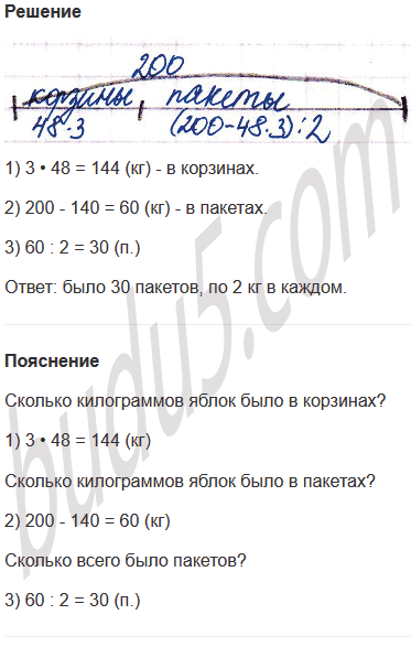 Задание № 3. В магазин привезли 200 кг яблок. Часть яблок разложили в 48 корзин по 3 кг в каждой, а остальные яблоки - в пакеты по 2 кг в каждом. Сколько было пакетов по 2 кг яблок?