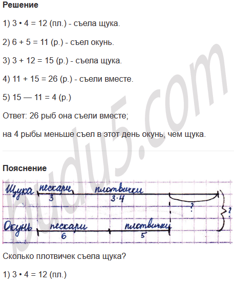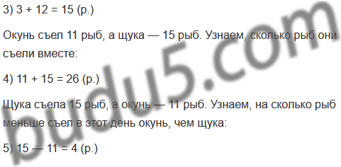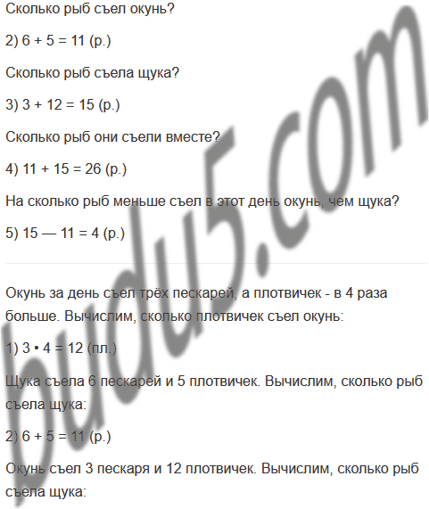Задание № 8. Щука за день съела трёх пескарей, а плотвичек — в 4 раза больше. Окунь в этот же день съел 6 пескарей и 5 плотвичек. На сколько рыб меньше съел в этот день окунь, чем щука? Сколько рыб съели они вместе?