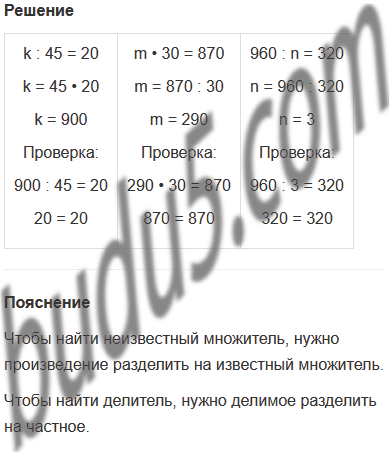 | k : 45 = 20 | m • 30 = 870 | 960 : n = 320 |