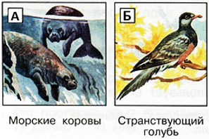 А) Морские коровы Б) Странствующий голубь В) Зубр
