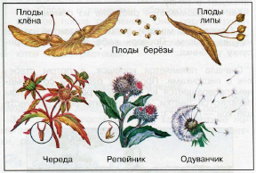 Рассмотрите плоды (клёна, липы, репейника и др.). Подумайте, как они распространяются. В чём видна их приспособленность к этому? Проверьте себя по тексту учебника.