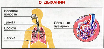 По рисунку мы видим, что дыхание человеку обеспечивают такие органы: носовая полость, трахея, бронхи, лёгкие. Все они составляют дыхательную систему. При вдохе через носовую полость, трахею и бронхи воздух попадает в лёгкие. Лёгкие состоят из множества маленьких пузырьков, в стенках которых постоянно движется кровь. Когда человек вдыхает, свежий воздух заполняет эти пузырьки. Кровь берёт из воздуха частицы кислорода, а отдаёт частицы углекислого газа. Кровь доставляет кислород каждому органу тела.