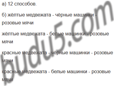 а) На полке в магазине 2 медвежонка - коричневый и жёлтый, 2 машинки - чёрная и белая - и 3 мяча - розовый, зелёный и голубой. Васе надо купить 3 игрушки: медвежонка, машинку и мяч. Сколькими способами он может это сделать?