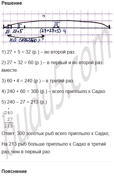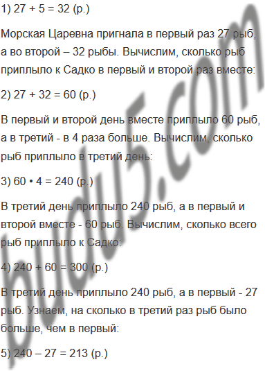 Задание № 9. Морская царевна пригнала для Садко в первый раз стаю из 27 золотых рыб, во второй раз - на 5 рыб больше, а в третий - в 4 раза больше, чем в первый и второй раз вместе. Сколько всего золотых рыб приплыло к Садко? На сколько в третий раз рыб было больше, чем в первый?