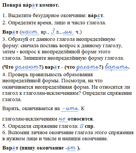 4. Проверь правильность образования неопределённой формы. Посмотри, на что оканчивается неопределённая форма. Не относится ли глагол к глаголам-исключениям? Определи спряжение глагола.