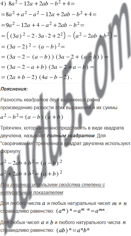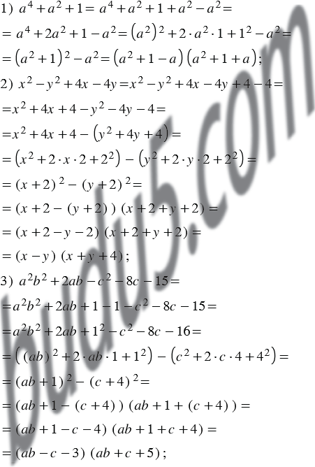 Разложите на множители многочлен, предварительно представив его в виде разности квадратов двух выражений:
