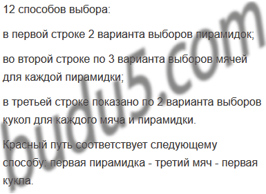 Задание № 6. У Зои 2 пирамидки, 3 мяча и 2 куклы. Она хочет выбрать из этих игрушек одну пирамидку, один мяч и одну куклу. На "дереве" показано, какими способами можно это сделать. Как составлено "дерево"? Каком способу соответствует красный путь? Сколько всего способов?