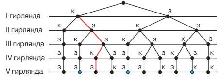 12. В коробке лежат 2 красные и 3 зелёные гирлянды. На дереве показаны все возможные комбинации этих гирлянд. Сколько всего комбинаций? Какие цепочки соответствуют синим точкам последнего ряда?