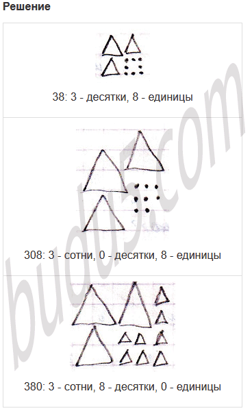 Задание № 1. Прочитай числа и объясни, что обозначает каждая цифра их записи: 38; 308; 380. Нарисуй изображение этих чисел в виде треугольников и точек.