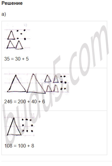 а) Представь число 35, 246 и 108 в виде суммы разрядных слагаемых. Построй их графические модели.