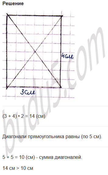 Задание № 21. Начерти прямоугольник со сторонами 3 см и 4 см. Проведи его диагонали, измерь и сравни их длины. Определи, что больше - периметр этого прямоугольника или сумма длин его диагоналей?