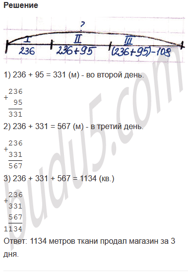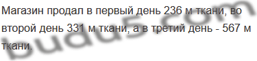 Задание № 31. Магазин продал в первый день 236 м ткани, во второй день - на 95 м больше, чем в первый день, а в третий день - на 108 м меньше, чем во второй день. Сколько метров ткани продал магазин за 3 дня?