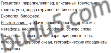 Параллелепипед, биосфера, суффикс, климат, вписанный треугольник, атмосфера, тангенс угла, олицетворение, архаизмы, природные зоны, литосфера, Мировой океан, географические координаты, метафора, хорда окружности, биссектриса, неологизмы, морфема, минералы, основа слова.