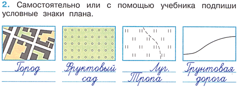 2. Самостоятельно или с помощью учебника подпиши условные знаки плана.