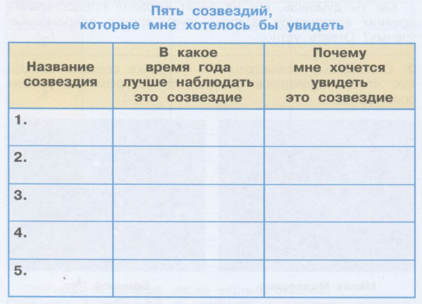 5. Выполняем задание Мудрой Черепахи – любительницы астрономии. С помощью атласа – определителя "От земли до неба" заполняем таблицу.