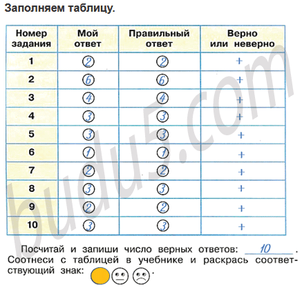 Выполни задания учебника на с. 154 – 159. При выполнении заданий заполняй таблицу. В столбце "Мой ответ" закрашивай кружок в тот цвет, который, на твой взгляд, соответствует правильному ответу. В столбце "Правильный ответ" закрась кружки так, как показано на "Страничках для самопроверки". Сравни эти два столбца и заполни третий: если твой ответ правильный, ставь знак "+", если неправильный – знак "–".