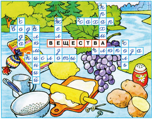 По горизонтали: 1. Вещество, из которого состоят реки, озёра, моря. 2. Вещество, которое есть в конфетах и шоколадках. 3. Вещества, имеющие кислый вкус. 4. Виноградный сахар.