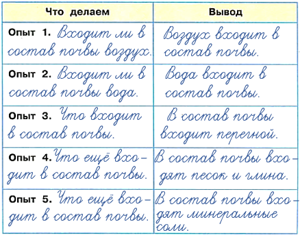 Ход работы: по заданиям учебника (опыты с нагреванием проводит учитель). По ходу работы заполняй таблицу "Состав почвы".