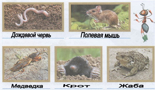 2. Среди знакомых Муравья Вопросика немало животных, обитающих в почве. В подземных галереях своего дома – муравейника – он развесил портреты друзей. Подпиши их (самостоятельно или с помощью учебника).
