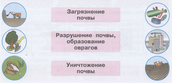 7. Расшифруй условные знаки по теме урока (устно). Укажи стрелками, к каким последствиям для почвы могут привести действия человека, выраженные этими знаками.