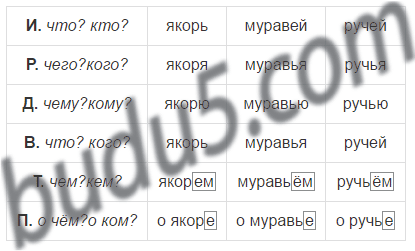 1. Просклоняйте письменно существительные якорь, муравей, ручей.