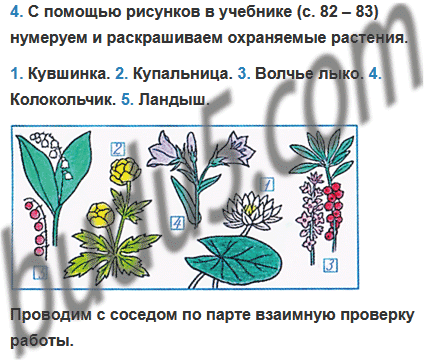 4. С помощью рисунков в учебнике (с. 82 – 83) пронумеруй и раскрась охраняемые растения.