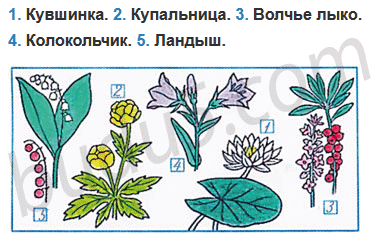 1. Кувшинка. 2. Купальница. 3. Волчье лыко. 4. Колокольчик. 5. Ландыш.