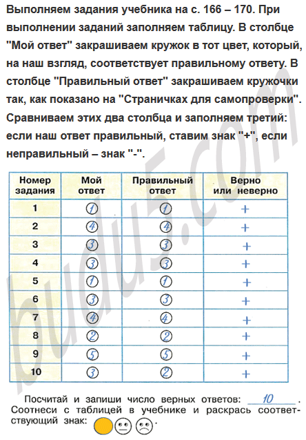 Выполни задания учебника на с. 166 – 170. При выполнении заданий заполняй таблицу. В столбце "Мой ответ" закрашивай кружок в тот цвет, который, на твой взгляд, соответствует правильному ответу. В столбце "Правильный ответ" закрась кружочки так, как показано на "Страничках для самопроверки". Сравни этих два столбца и заполни третий: если твой ответ правильный, ставь знак "+", если неправильный – знак "-".