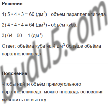 Задание № 64. Коробка формы прямоугольного параллелепипеда имеет длину 5 дм, ширину 4 дм и высоту 3 дм. А коробка формы куба имеет ребро, равное 4 дм. Объём какой из этих коробок больше и на сколько кубических дециметров?