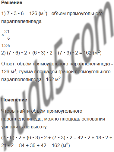 Задание № 65. Измерения прямоугольного параллелепипеда - 7 м, 3 м и 6 м. Найди его объём и сумму площадей его граней.