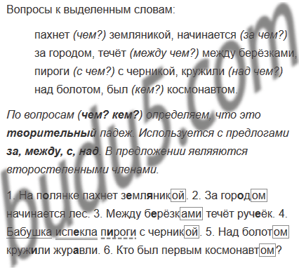 пахнет (чем?) земляникой, начинается (за чем?) за городом, течёт (между чем?) между берёзками, пироги (с чем?) с черникой, кружили (над чем?) над болотом, был (кем?) космонавтом.