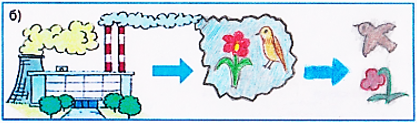 б) Здесь из – за выбросов дыма заводов и фабрик страдают животные и растения. Они болеют, плохо развиваются.