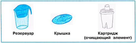 Бытовой фильтр состоит из нескольких частей: ёмкость для очищенной воды (резервуар), ёмкость для очищаемой воды, фильтр (картридж), крышка. Ёмкость для очищенной воды самая большая, она имеет ручку и крышку. В её верхнюю часть вставляется ёмкость для очищаемой воды. К нижней части ёмкости для очищаемой воды крепится фильтр с очищающими веществами.