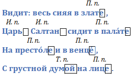 Первое четверостишие из сказки А. С. Пушкина "Сказка о Царе Салтане, о сыне его славном и могучем богатыре князе Гвидоне Салтановиче и о прекрасной царевне Лебеди". Второе четверостишие из сказки А. С. Пушкина "Сказка о рыбаке и рыбке".