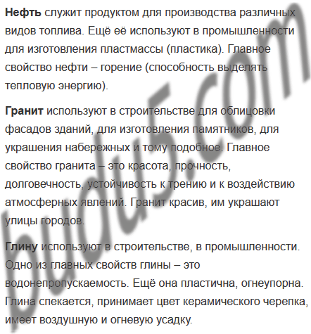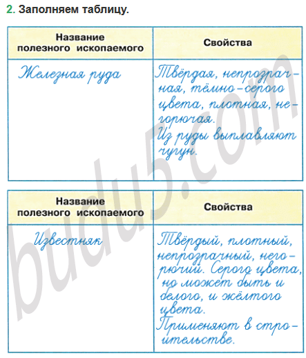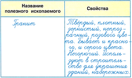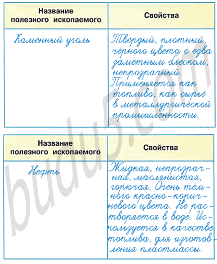 1. Рассматриваем образец полезного ископаемого. По иллюстрациям учебника определяем его название. При необходимости воспользуемся атласом-определителем. (Пояснение: учитель даёт образец одного полезного ископаемого. Ниже в таблицах приведён пример описания нескольких образцов.)