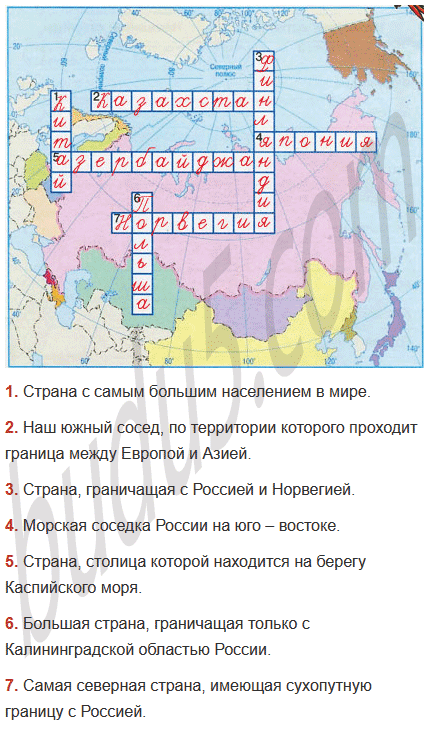 1. Используя карту учебника, пронумеруй некоторые страны, граничащие с Россией.